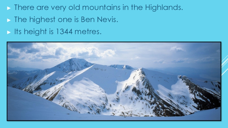 There are very old mountains in the Highlands. The highest one is Ben Nevis. Its height is