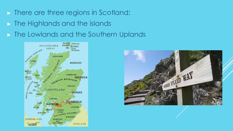 There are three regions in Scotland: The Highlands and the islandsThe Lowlands and the Southern Uplands