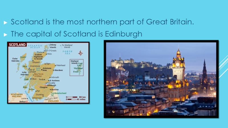Scotland is the most northern part of Great Britain.The capital of Scotland is Edinburgh