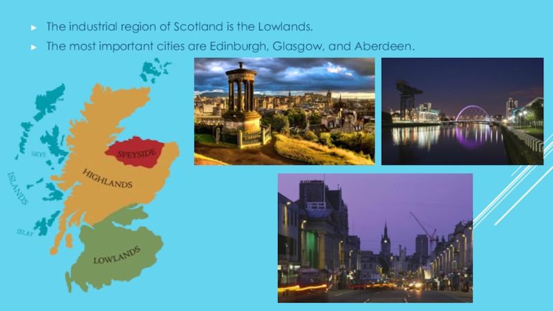 The industrial region of Scotland is the Lowlands. The most important cities are Edinburgh, Glasgow, and Aberdeen.