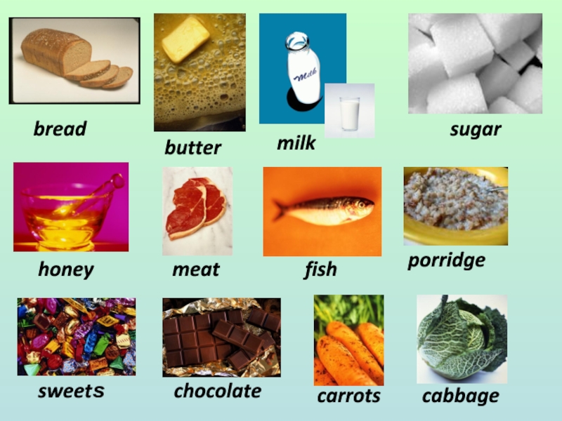 sweetshoneybreadbuttersugarmilkmeatfishporridgechocolate carrots cabbage