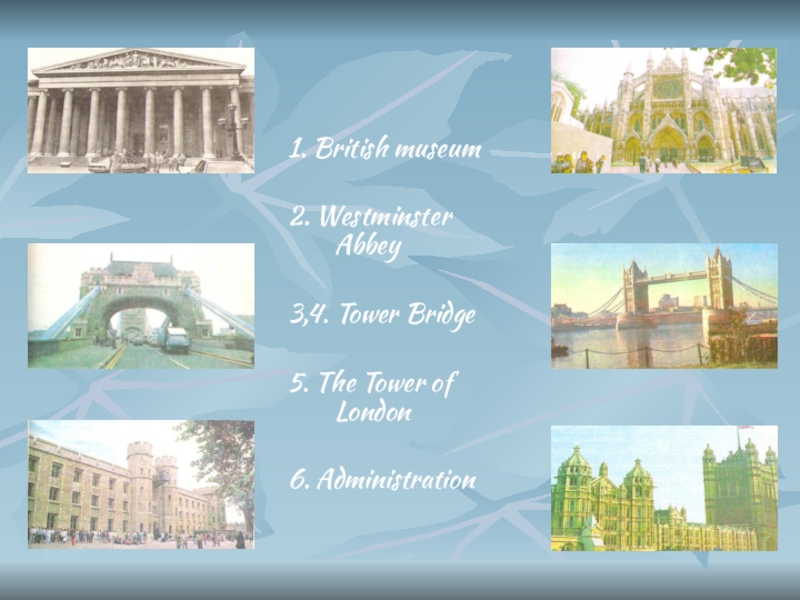 1. British museum2. Westminster Abbey3,4. Tower Bridge5. The Tower of London6. Administration