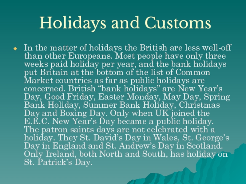 well-off than other Europeans. Most people have only three weeks paid holiday per year, and the bank holidays put Britain at the bottom of the list of Common Market countries as far as public holidays are concerned. British “bank holidays” are New Year’s Day, Good Friday, Easter Monday, May Day, Spring Bank Holiday, Summer Bank Holiday, Christmas Day and Boxing Day. Only when UK joined the E.E.C. New Year’s Day became a public holiday. The patron saints days are not celebrated with a holiday. They St. David’s Day in Wales, St. George’s Day in England and St. Andrew’s Day in Scotland. Only Ireland, both North and South, has holiday on St. Patrick’s Day.