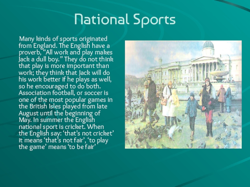 from England. The English have a proverb, “All work and play makes Jack a dull boy.” They do not think that play is more important than work; they think that Jack will do his work better if he plays as well, so he encouraged to do both. Association football, or soccer is one of the most popular games in the British Isles played from late August until the beginning of May. In summer the English national sport is cricket. When the English say: ‘that’s not cricket’ it means ‘that’s not fair’, ‘to play the game’ means ‘to be fair’