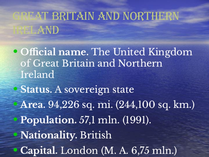 Great Britain and Northern IrelandOfficial name. The United Kingdom of Great Britain and Northern IrelandStatus. A sovereign stateArea. 94,226 sq. mi. (244,100 sq. km.)Population. 57,1 mln. (1991).Nationality. BritishCapital. London (M. A. 6,75 mln.)