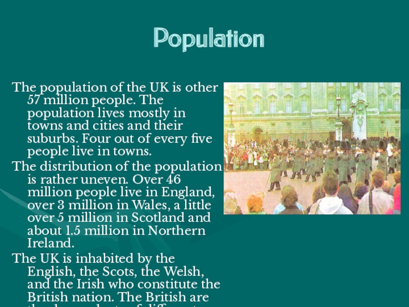 PopulationThe population of the UK is other 57 million people. The population lives mostly in towns and