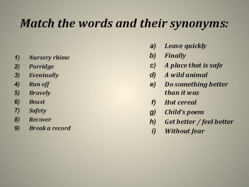 Match the words and their synonyms:Nursery rhimePorridgeEventuallyRun offBravelyBeastSafetyRecoverBreak a recordLeave quicklyFinallyA place that is safeA wild animalDo