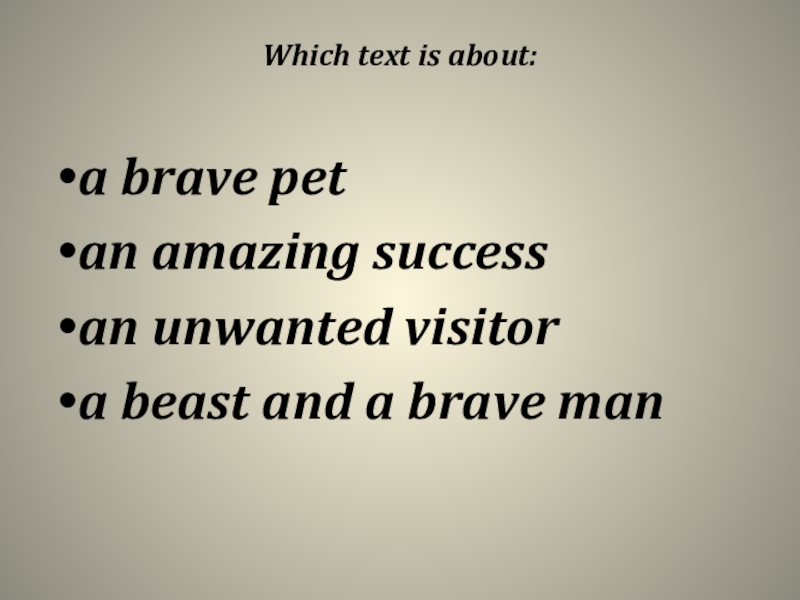Which text is about:a brave petan amazing successan unwanted visitora beast and a brave man