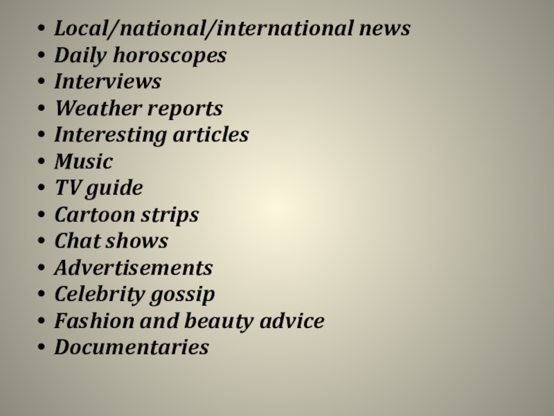 Local/national/international newsDaily horoscopesInterviewsWeather reportsInteresting articlesMusicTV guideCartoon stripsChat showsAdvertisementsCelebrity gossipFashion and beauty adviceDocumentaries