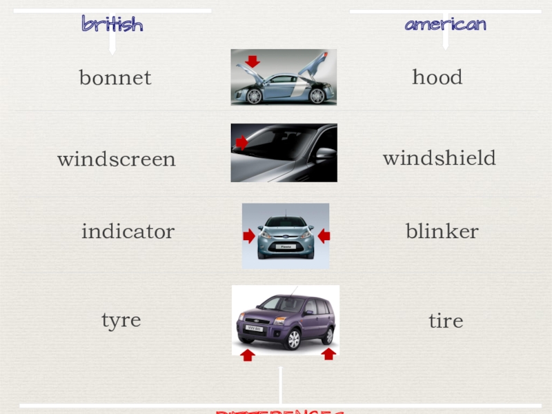 britishamericanhoodwindscreenwindshieldindicatorblinkertyretireDIFFERENCESbonnet
