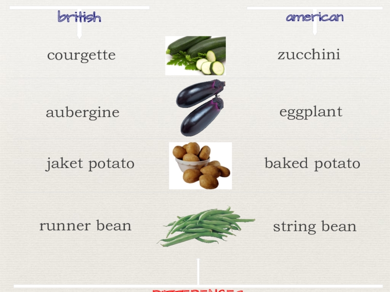 britishamericanzucchiniaubergineeggplantjaket potatobaked potatorunner beanstring beanDIFFERENCEScourgette