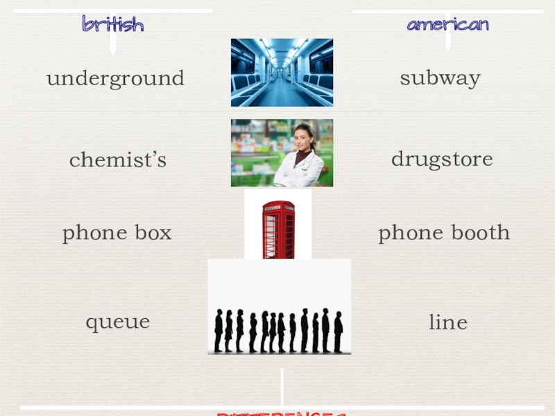 britishamericansubwaychemist’sdrugstorephone boxphone boothqueuelineDIFFERENCESunderground