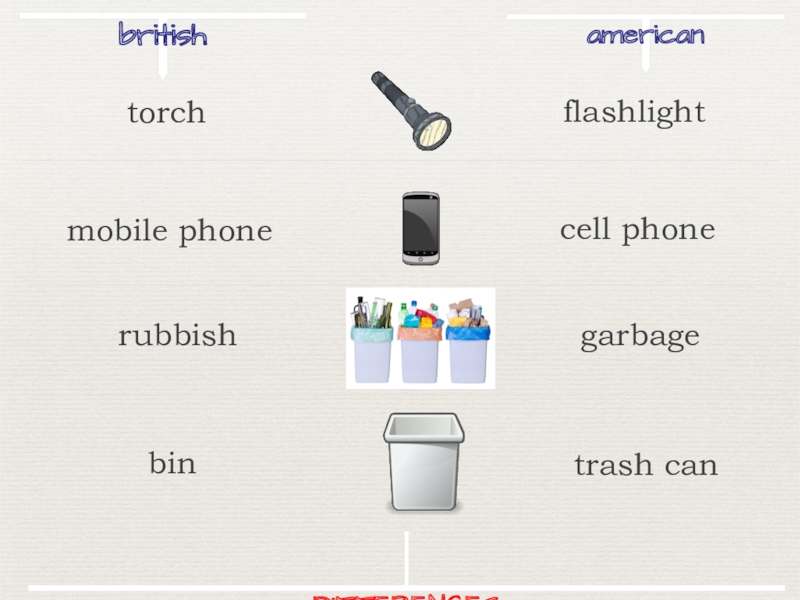 britishamericanflashlightmobile phonecell phonerubbishgarbagebintrash canDIFFERENCEStorch