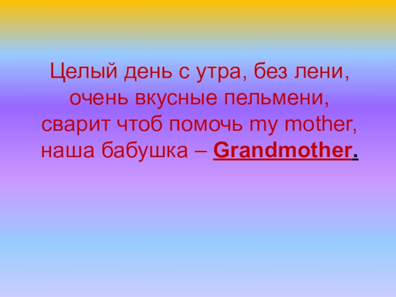 Целый день с утра, без лени, очень вкусные пельмени, сварит чтоб помочь my mother, наша бабушка –