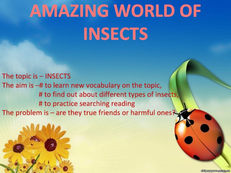 AMAZING WORLD OF INSECTSThe topic is – INSECTSThe aim is –# to learn new vocabulary on the topic, # to find out about different types of