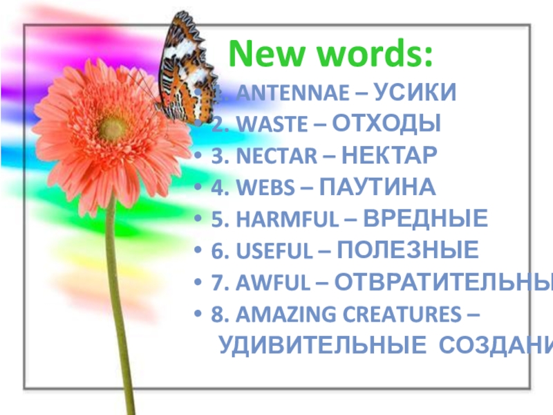 New words:1. antennae – усики 2. waste – отходы3. nectar – нектар4. webs – паутина5. harmful –