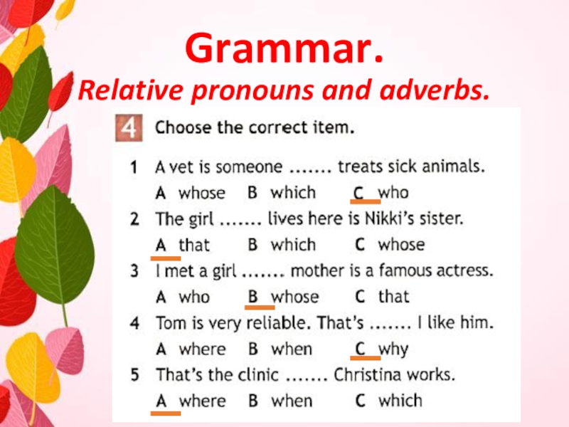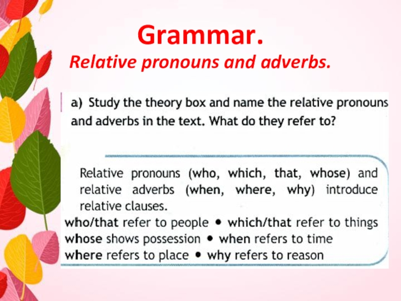 Слайд 5Grammar. Relative pronouns and adverbs.