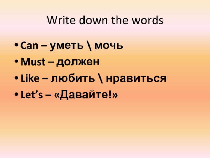 Write down the wordsCan – уметь \ мочьMust – долженLike – любить \ нравитьсяLet’s – «Давайте!»