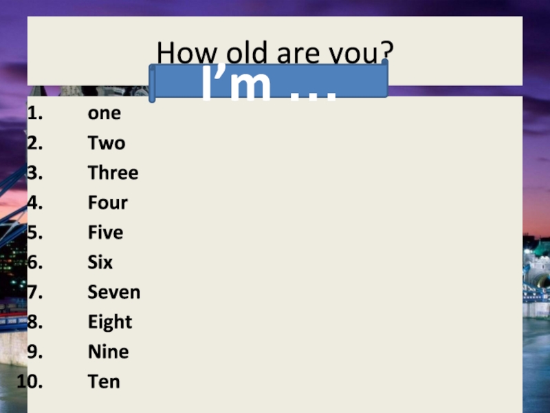 How old are you?oneTwoThreeFourFiveSixSeven EightNineTenElevenTwelveThirteenFourteenFifteenSixteenSeventeenEighteenNineteenTwentyI’m …