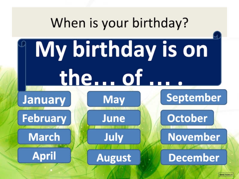 When is your birthday?My birthday is on the… of … .JanuaryFebruaryMarchAprilMayJuneJulyAugustSeptemberOctoberNovemberDecember