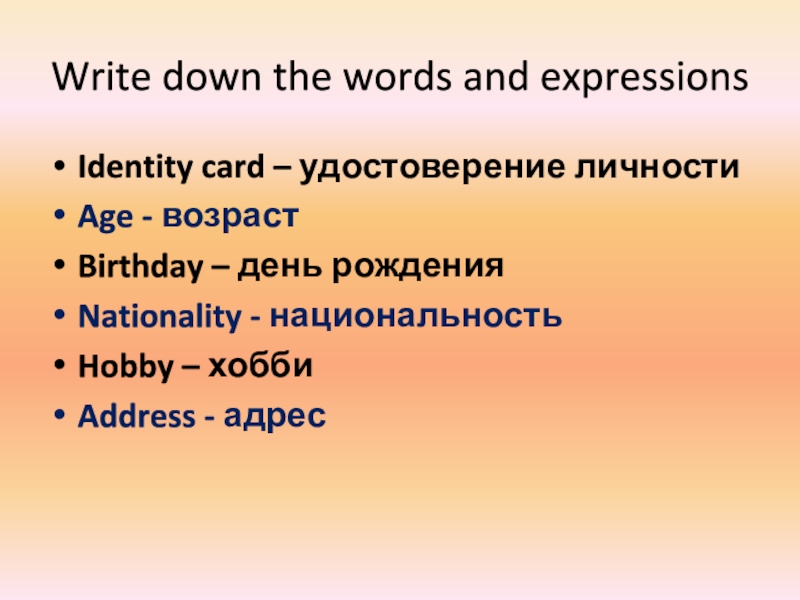 Write down the words and expressionsIdentity card – удостоверение личностиAge - возрастBirthday – день рожденияNationality - национальностьHobby