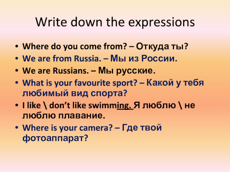 Write down the expressionsWhere do you come from? – Откуда ты?We are from Russia. – Мы из
