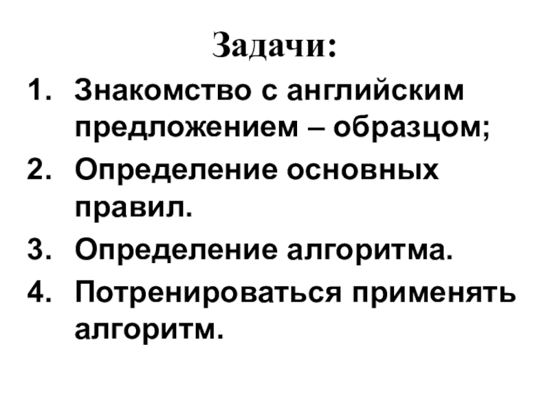 Задачи:Знакомство с английским предложением – образцом; Определение основных правил. Определение алгоритма. Потренироваться применять алгоритм.