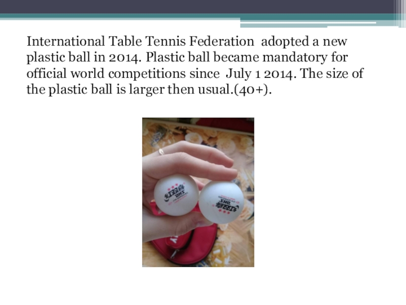 Слайд 4International Table Tennis Federation adopted a new plastic ball in 2014.