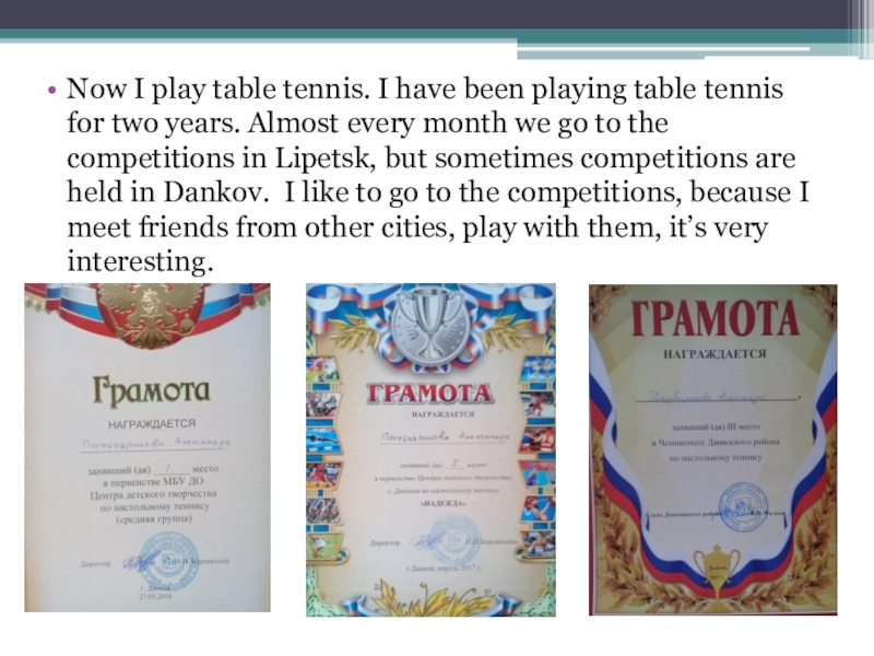 Now I play table tennis. I have been playing table tennis for two years. Almost every month