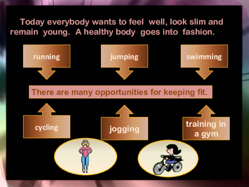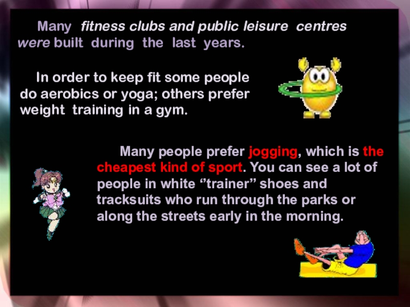 Many people prefer jogging, which is the cheapest kind of sport. You can see a lot of people in white ‘’trainer’’ shoes and tracksuits who run through the parks or along the streets early in the morning.