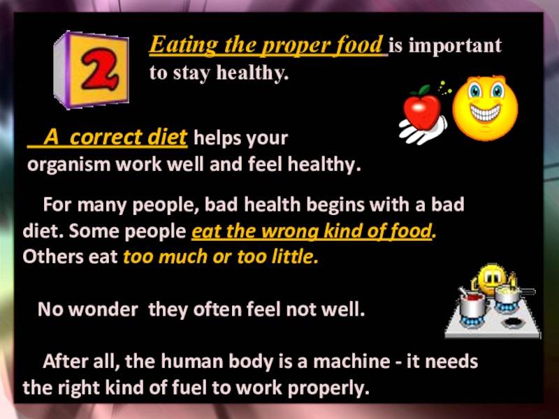 For many people, bad health begins with a bad diet. Some people eat the wrong kind of food. Others eat too much or too little.