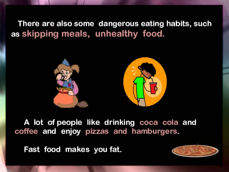 A lot of people like drinking coca cola and coffee and enjoy pizzas and hamburgers.