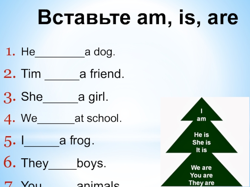 Вставьте am, is, are He________a dog.Tim _____a friend.She_____a girl.We______at school.I_____a frog. They____boys.You_____animals.Ann____9 years.We____doctors.My cat_____black.