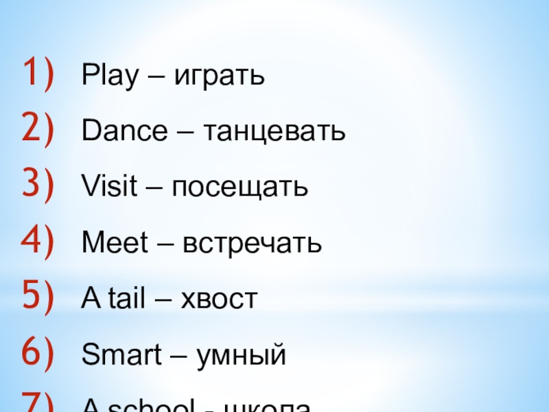Play – игратьDance – танцеватьVisit – посещатьMeet – встречатьA tail – хвостSmart – умныйA school - школа