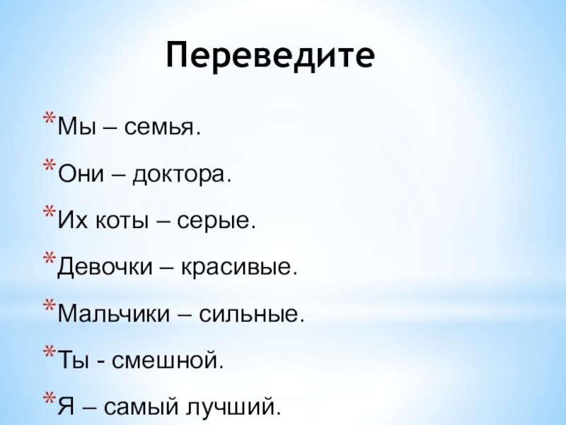 Переведите Мы – семья.Они – доктора.Их коты – серые.Девочки – красивые.Мальчики – сильные.Ты - смешной.Я – самый