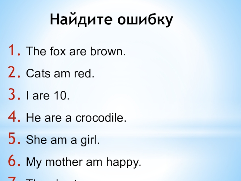 Найдите ошибку The fox are brown.Cats am red.I are 10.He are a crocodile.She am a girl.My mother