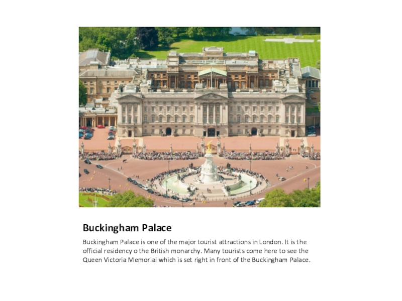 Buckingham PalaceBuckingham Palace is one of the major tourist attractions in London. It is the official residency o the British monarchy. Many tourists come here to see the Queen Victoria Memorial which is set right in