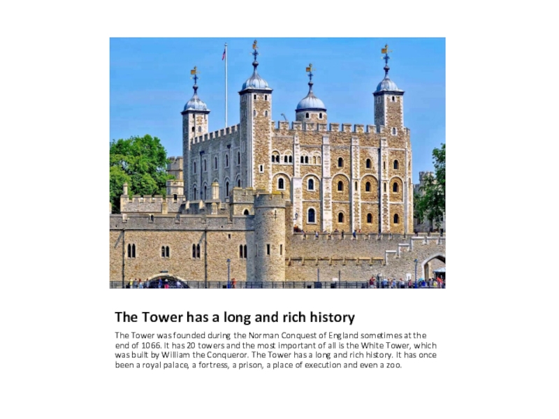 during the Norman Conquest of England sometimes at the end of 1066. It has 20 towers and the most important of all is the White Tower, which was built by William the Conqueror. The Tower has a long and rich history. It has once been a royal palace, a fortress, a prison, a place of execution and even a zoo.