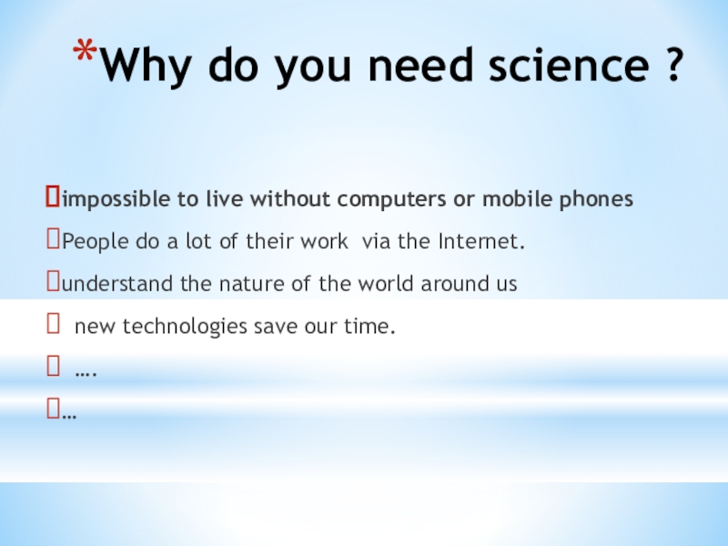 Why do you need science ? impossible to live without computers or mobile phonesPeople do a lot of their work via the Internet.understand the nature of the world around us  new technologies save our time. ….…