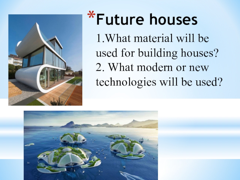 Future houses1.What material will be used for building houses?2. What modern or new technologies will be used?