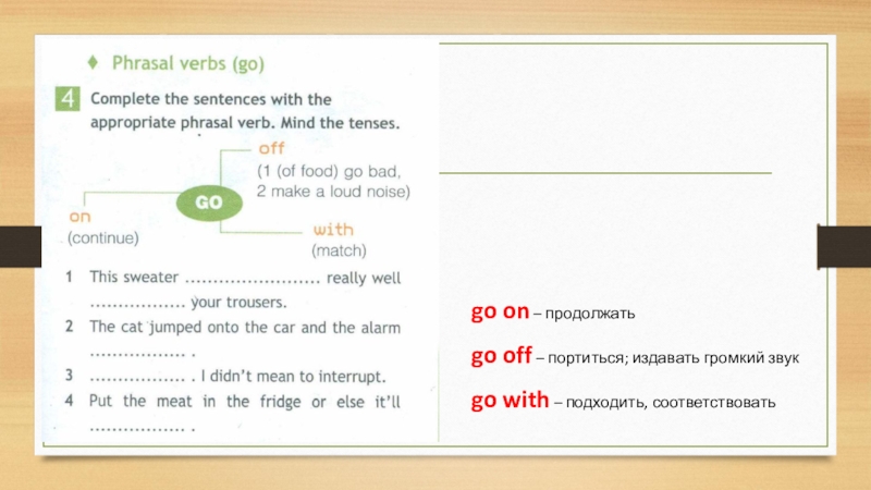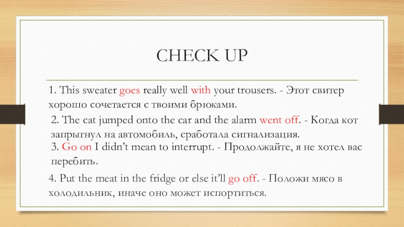 1. This sweater goes really well with your trousers. - Этот свитер хорошо сочетается с твоими брюками.