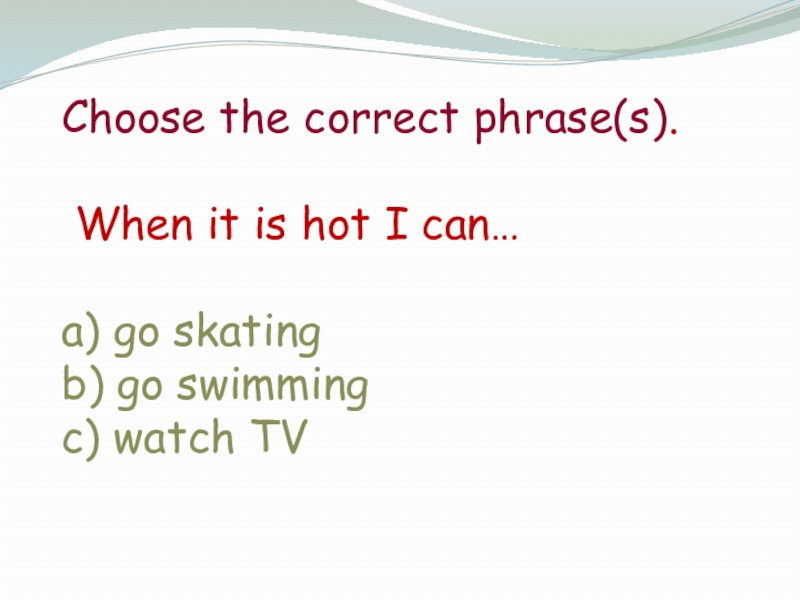 Слайд 6Choose the correct phrase(s). When it is hot I can… a) go