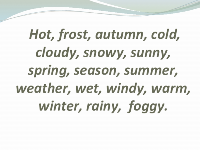 Слайд 2 Hot, frost, autumn, cold, cloudy, snowy, sunny, spring, season, summer,