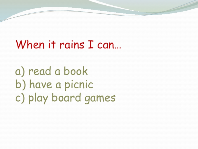 Слайд 8When it rains I can… a) read a book b) have a picnic c)