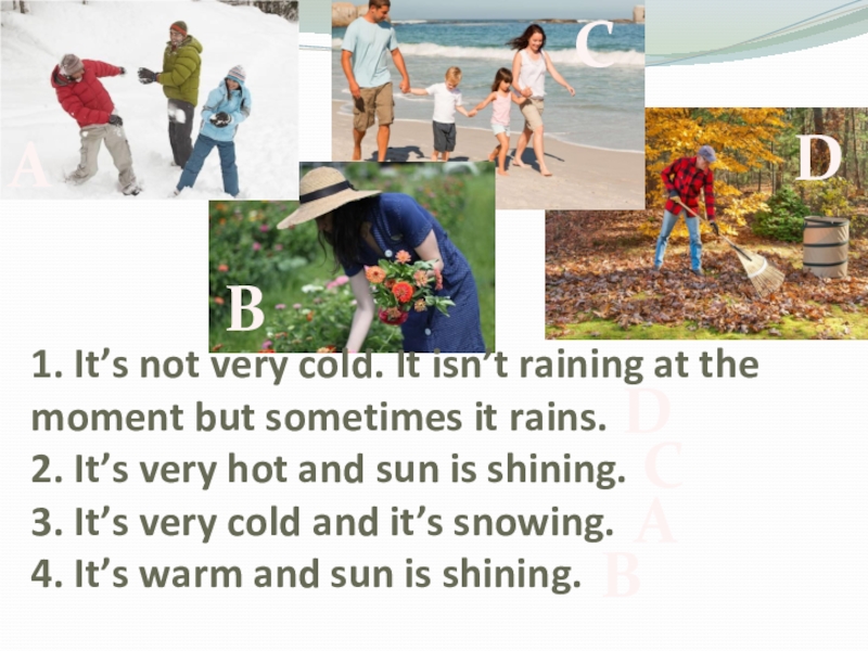but sometimes it rains. 2. It’s very hot and sun is shining. 3. It’s very cold and it’s snowing. 4. It’s warm and sun is shining.