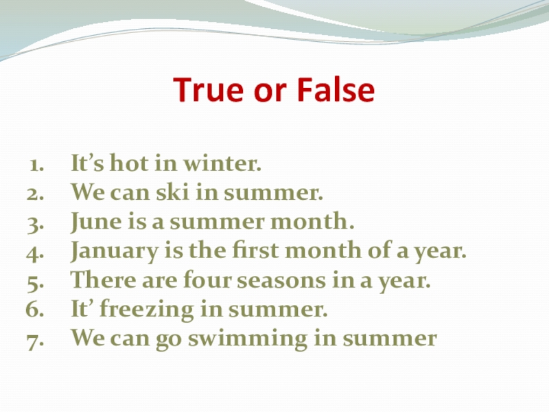 True or FalseIt’s hot in winter.We can ski in summer.June is a summer month.January is the first