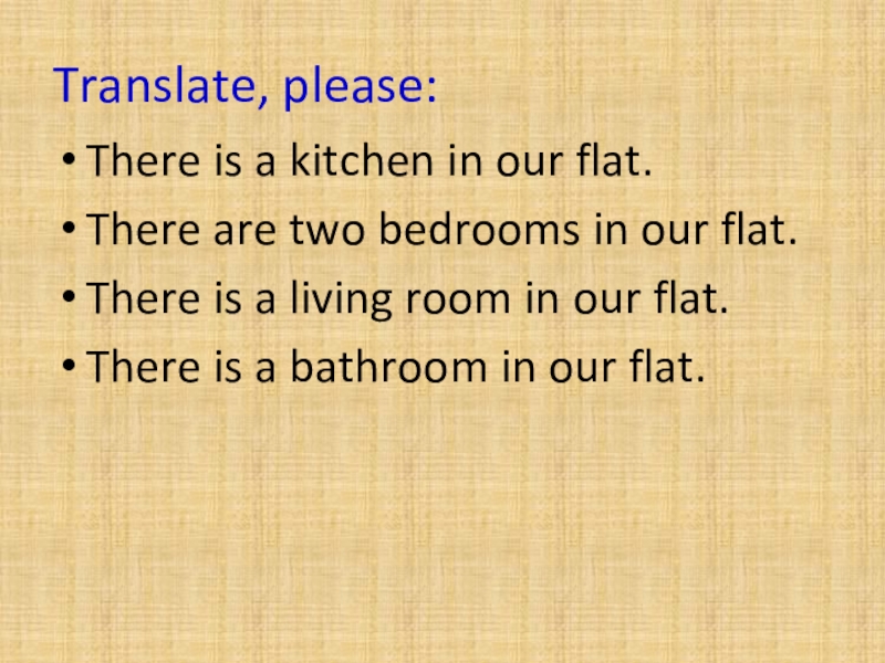 Translate, please:There is a kitchen in our flat.There are two bedrooms in our flat.There is a living