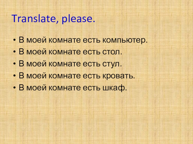 Translate, please.В моей комнате есть компьютер.В моей комнате есть стол.В моей комнате есть стул.В моей комнате есть
