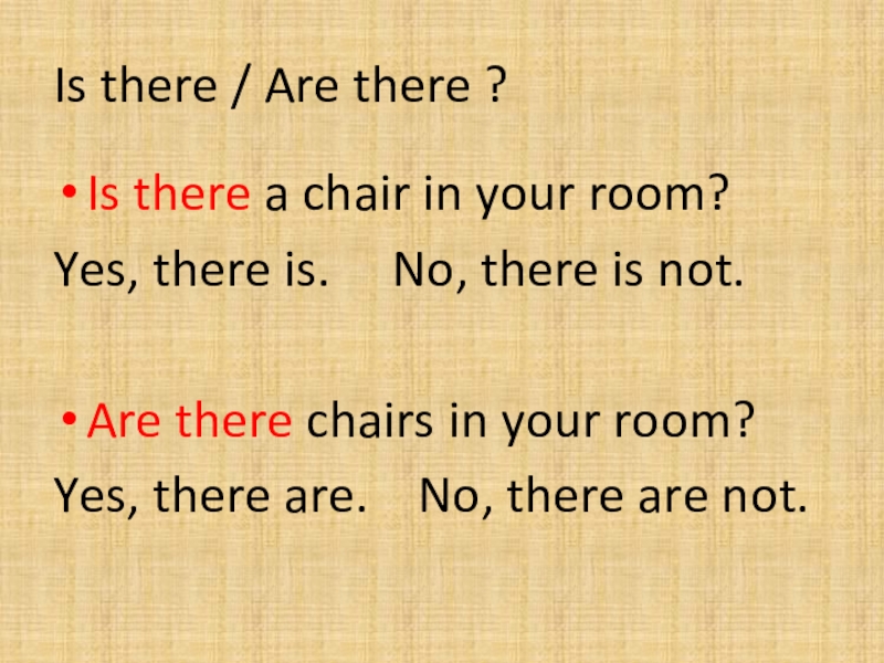 Is there / Are there ?Is there a chair in your room?Yes, there is.   No,