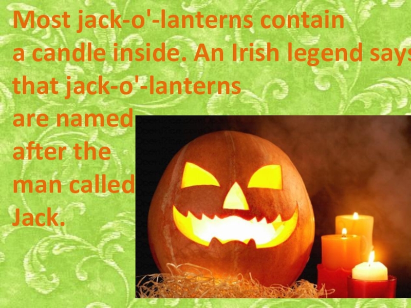 Most jack-o'-lanterns contain a candle inside. An Irish legend says that jack-o'-lanterns are namedafter the man called